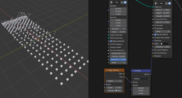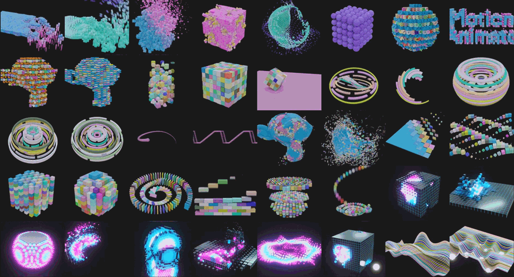 Motion Array: Generate array objects, vertex distribution, point instancing, and it has several built-in basic model presets. Set number, spacing, offset, radius, custom instance, voxel, etc., and some attribute output.