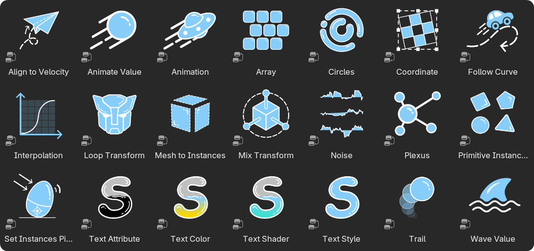 Mesh to Instances Node: An enhanced version of the built-in Split to Instances node. Supports splitting by Group ID, Color ID, and Mesh Island, and lets you set the pivot point for instances.